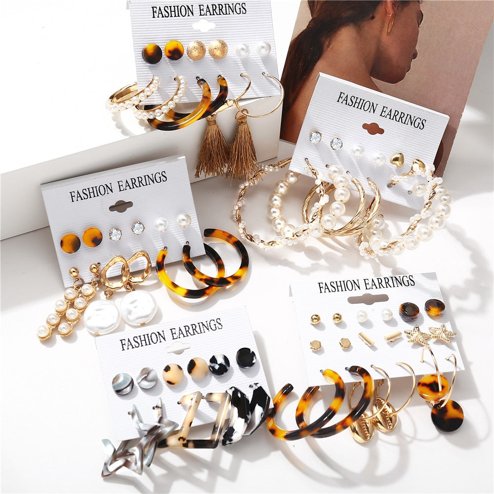 2019 earrings Set: Shell Hoop Earrings Geometric Earring Leopard Earrings Tassel Earring
